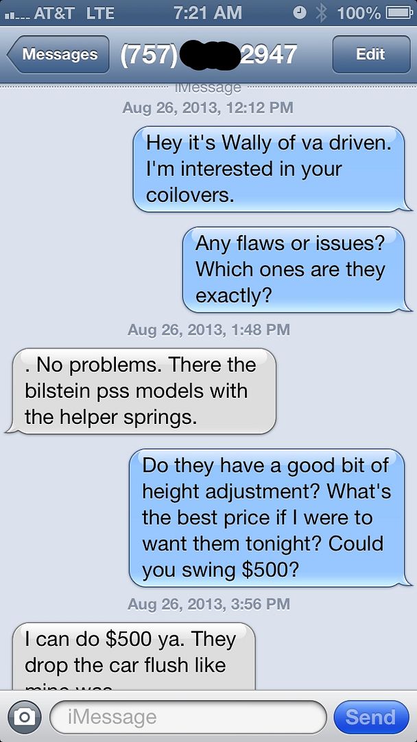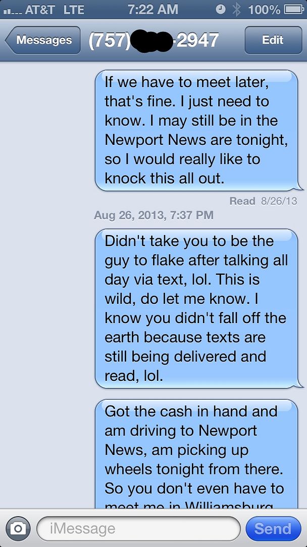 Conversation in spoiler (notice how it indicates READ 8/26/13 when I sent it, but not even a one word response; after I let him know I was waiting at a fucking gas station):