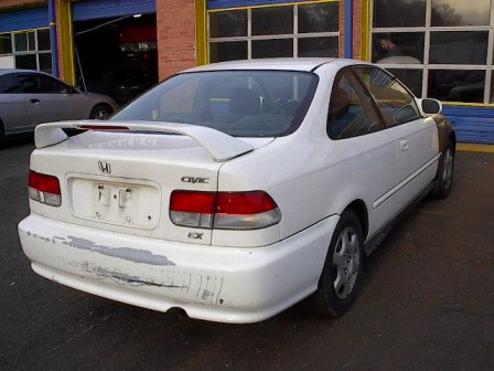 Okay, here's what i got. its a 2000 honda civic ex automatic with 108k miles. It has a rear spoiler and new cd player. Its white with grey interior. The interior is in great condition, no rips no tears. Here is the history as far as i know. I purchased the car at an insurance auction as a theft recovery. It now has a clean virginia title. i had to replace the following: hood, right fender, grille, bumper cover, seats, and airbags. I have a 2000 ex coupe identical to this on this site, so i got all parts from it, but i ordered a new hood, right fender and bumper cover and grille because i used those parts i had on another car. So the car is white with a black fender, black hood, and black bumper cover and grille. I was going to paint and blend the front end but decided to just sell it cheap to the first person interested. It has both side skirts now. So, i've got options for you guys, so here they are....