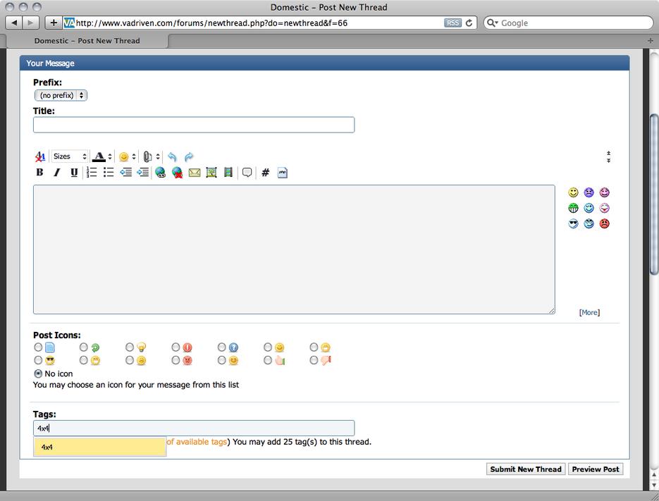 If you would like to make a "for sale" post for your 4x4 or off-road vehicle or parts, look for the section in your post that says "Tags". It's directly under the body of the post. In this section, simply add "4x4".