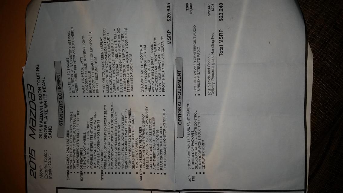 Description: Vehicle being sold is a 2015 Mazda 3 i-Touring sedan. The exterior color is snowflake white pearl and interior color is sand. It was purchased new from Hall Mazda and only has 11,342 miles on it. Exterior is flawless and interior is excellent besides a couple spots on the driver/passenger seats. Windows have an aftermarket tint with a lifetime warranty included. The oil has been changed twice and serviced according to the manufacturer's recommendations at Hall Mazda. One free oil change is left from the three that came with purchasing from Hall. Please contact me with any questions or concerns, thanks!